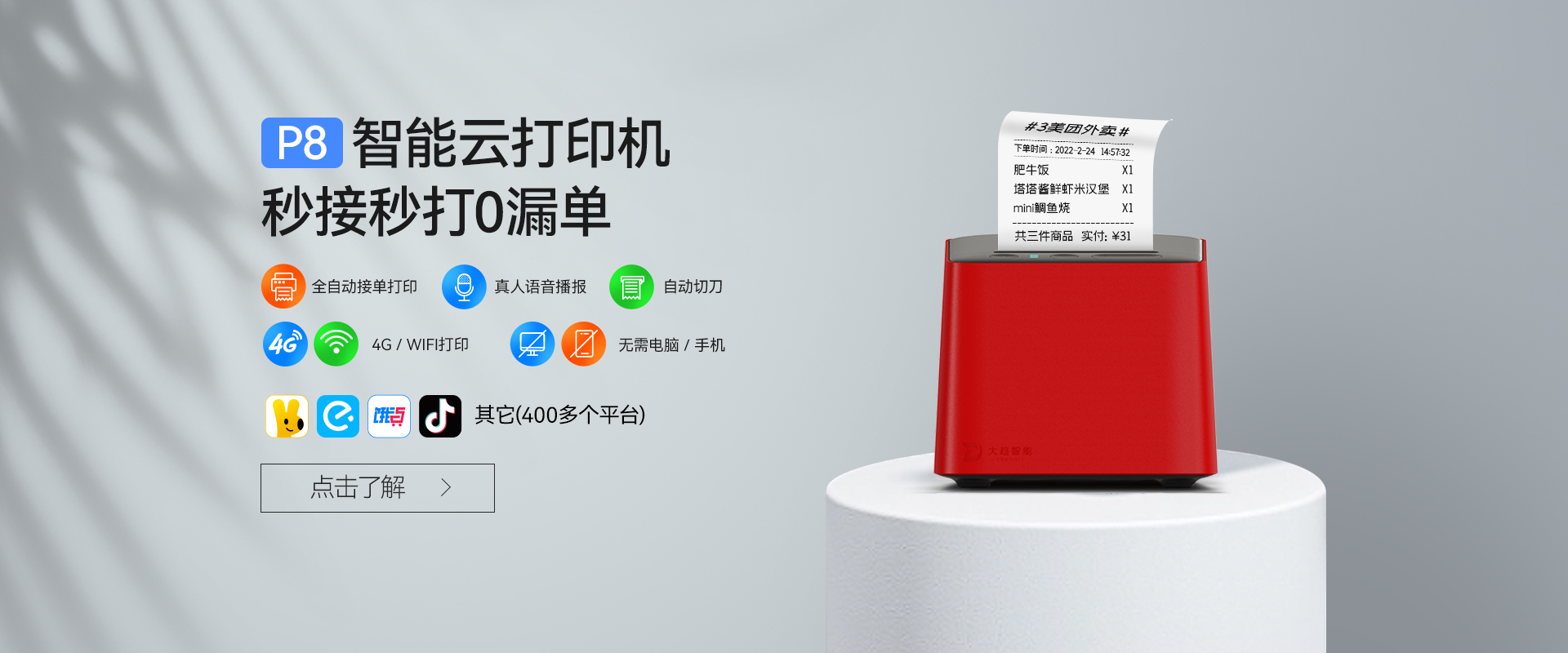 大趨智能,創(chuàng)立于2016年,位于深圳市南山區(qū),注冊(cè)資金2000萬元,是國(guó)內(nèi)領(lǐng)先的智能支付解決方案供應(yīng)商,專注外賣云打印機(jī),熱敏打印機(jī),票據(jù)打印機(jī),藍(lán)牙打印機(jī),wifi打印機(jī)等智能云打印機(jī)設(shè)備。 旗下品牌小店掌柜主要致力于為中小微商戶提供SaaS服務(wù)一站式解決方案,具備業(yè)內(nèi)獨(dú)有的多項(xiàng)聚合功能,主要包括掃碼點(diǎn)餐、自營(yíng)外賣、聚合外賣、聚合管理、聚合營(yíng)銷、聚合配送等服務(wù),助力商戶低成本實(shí)現(xiàn)高效經(jīng)營(yíng),形成互利共榮的一體化生態(tài)系統(tǒng),提升收益與效率。